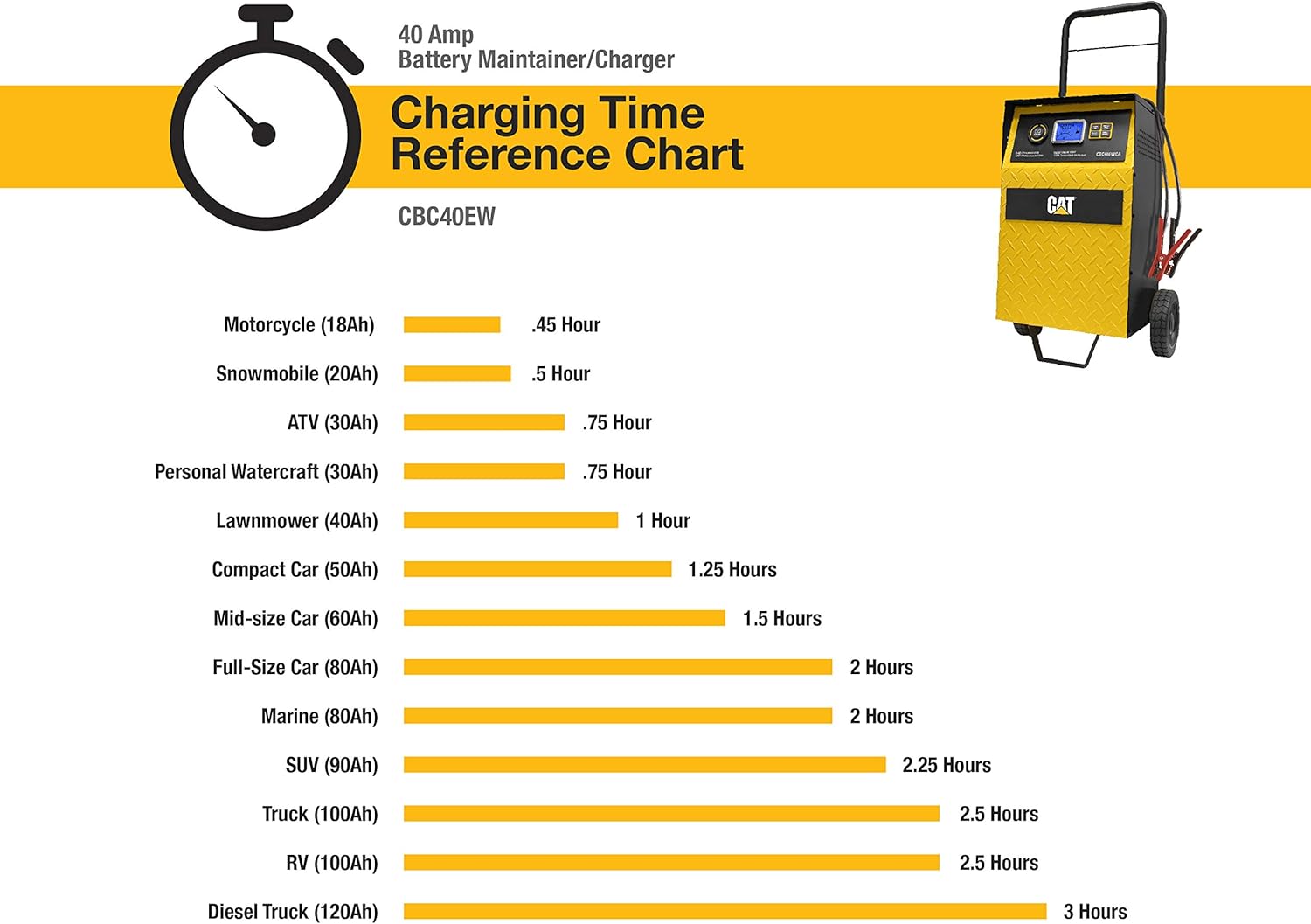 It also comes with patented features like a 110 Amp engine start reverse polarity alarm alternator check and an easy-to-read LCD display. This is the new CAT 12 Volt Wheeled Battery Charger Model CBC40EW. Up to 7 cash back The CAT 40 amp high-frequency 12V battery charger provides automatic multi-stage charging for 12 Volt battery systems.